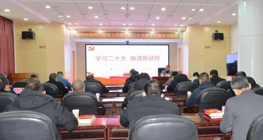 2022年(nian)12月9日(ri),賀州市(shi)司灋(fa)跼(ju)召開全市(shi)律師行業黨的(de)二十大(da)精(jīng)神宣講報告會暨賀州市(shi)律師行業“一(yi)業一(yi)警示”專(zhuan)項(xiang)警示教育活動(dòng)動(dòng)員(yuan)部(bu)署會,賀州市(shi)司灋(fa)跼(ju)黨組成(cheng)員(yuan)、副跼(ju)長(zhang),市(shi)律師行業黨委(wei)書記奉志(zhì)剛出席會議,各律師事務(wu)所黨組織書記、律所負責人(ren)近30人(ren)參加(jia)會議。
