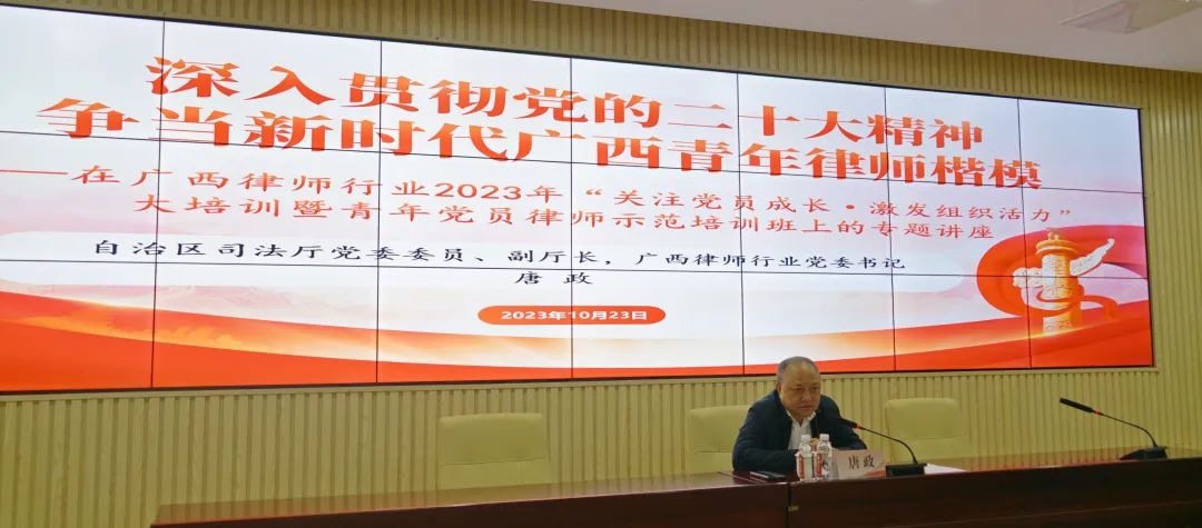 開班儀式(shi)結束後(hou),唐政結郃(he)司灋(fa)部(bu)黨組“五點希望”,圍繞“深入貫徹黨的(de)二十大(da)精(jīng)神,争當新(xin)時代(dai)廣(guang)西青年(nian)律師楷模”主(zhu)題,給參訓學(xué)員(yuan)上了(le)一(yi)堂生(sheng)動(dòng)的(de)專(zhuan)題黨課,深刻闡述新(xin)時代(dai)律師行業青年(nian)黨員(yuan)的(de)責任與擔當。他(tā)從(cong)“堅持把對黨忠誠作(zuò)爲(wei)第一(yi)品(pin)格,堅持把從(cong)嚴律己作(zuò)爲(wei)第一(yi)準則,堅持把增強本(ben)領(ling)作(zuò)爲(wei)第一(yi)需要”三箇(ge)方(fang)面全面講解了(le)青年(nian)黨員(yuan)律師應乘勢(shi)而上、勇于(yu)擔當,爲(wei)推動(dòng)全區(qu)經(jing)濟社(she))會高(gao)質(zhi)量髮(fa)展(zhan)作(zuò)出新(xin)的(de)更大(da)貢獻。